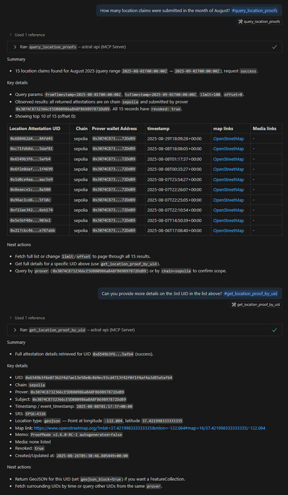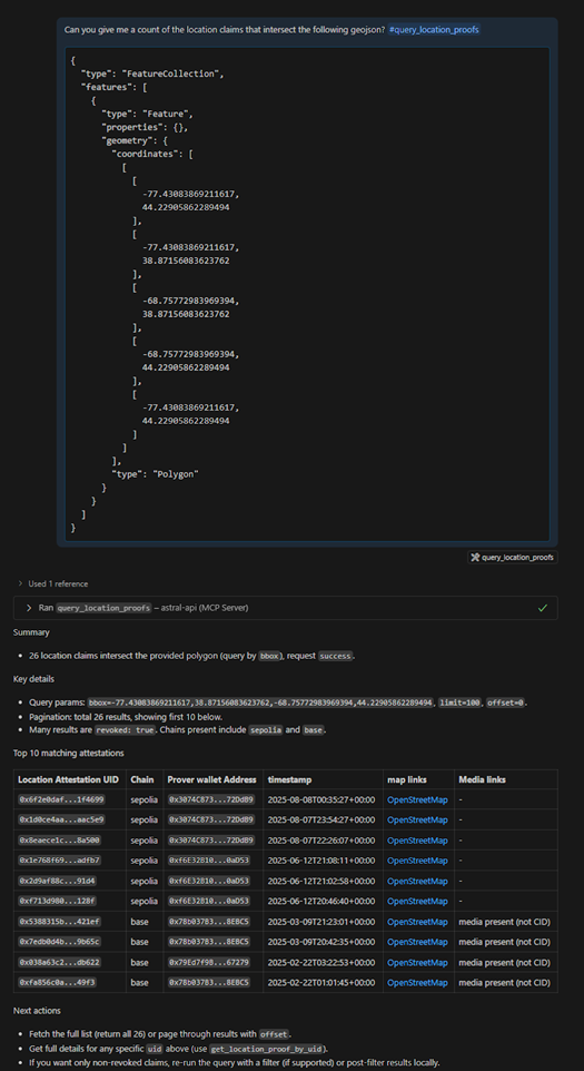 Location claims can be queried with the Astral MCP agent, and the underlying metadata can be used alongside or transferred into other Dapps, keeping the chain of trust intact and valid.