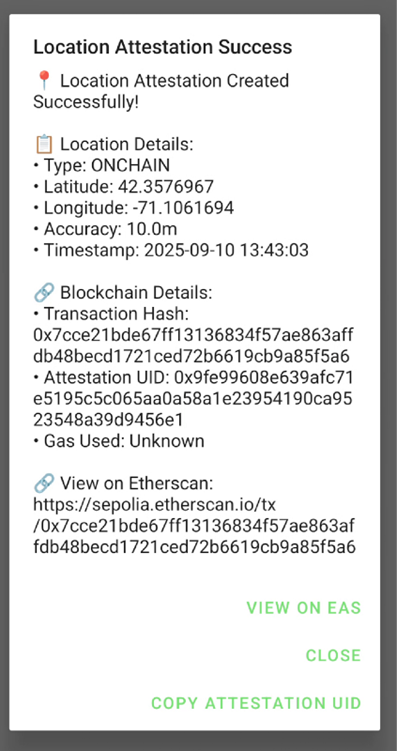 Once the submission is complete, users can view the resulting location attestation on EAS. From there, they can share this attestation, which functions as: