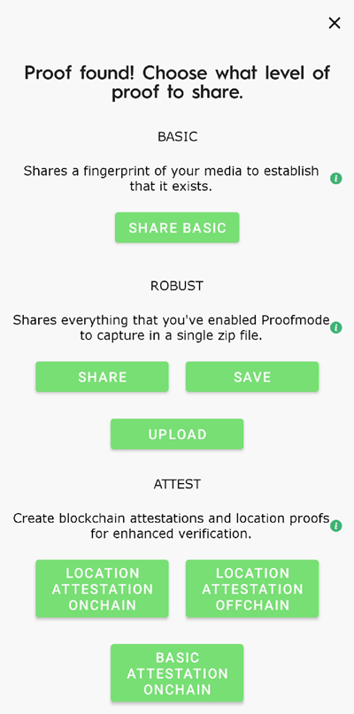 Within the settings menu, users can enable an array of proof options pertaining to the metadata that appears in the generated proof. Depending on the need or use case, enabling more proof options will make the proof metadata more robust. To enable the ability to create and share location attestations in Proofmode, the “location” option must be enabled in this menu.